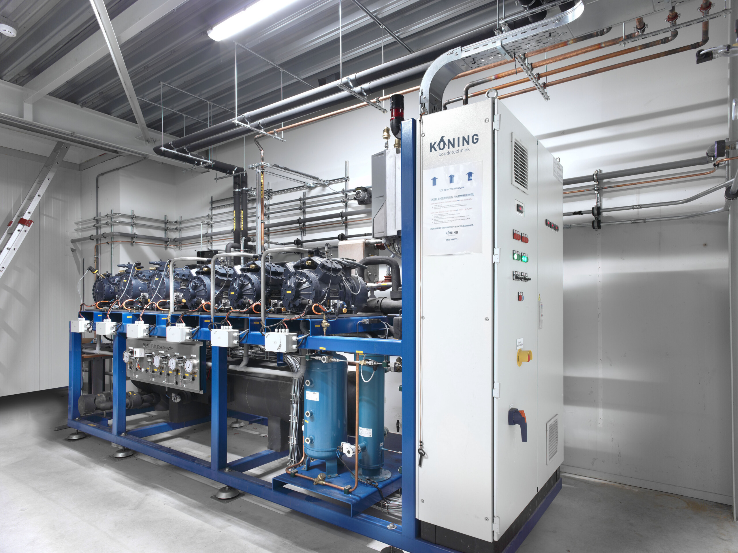 Strategisch verteilt über die neue Gefrierhalle von Coldstore Van de Bunt installierten wir neue Gefrierverdampfer. Die bestehende Gefrieranlage passten wir an diesen zusätzlichen Bedarf an, so dass die Erweiterung problemlos angeschlossen werden konnte. Gleichzeitig analysierten wir die Regeltechnik und installierten einen neuen modernen Schaltschrank. So haben wir nicht nur die Gefrierleistung erhöht, sondern auch die Betriebssicherheit der Gefrieranlage verbessert. Durch den Einsatz der Wärmerückgewinnung haben wir das System zudem nachhaltig gestaltet. Mit der erzeugten Kältewärme versorgen wir ausserdem die Fußbodenheizung von Coldstore Van de Bunt, ebenso wie das Heizsystem in den Büroräumen. Das zeigt einmal mehr: Bei Koning Koudetechniek machen wir vieles möglich. Wir sorgen sogar dafür, dass Sie es in einer Gefrierhalle schön warm haben.
