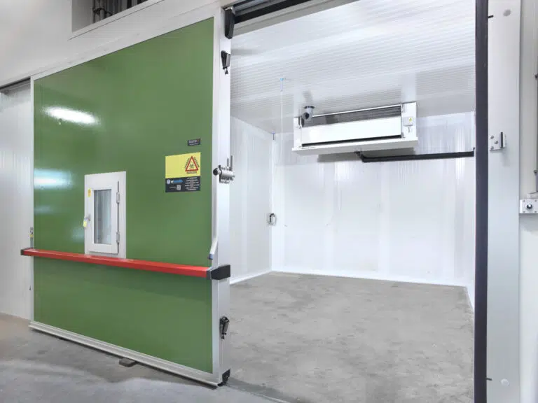 Anschließend haben wir die drei bestehenden Kühlzellen an die zentrale Anlage angeschlossen, ebenso wie die drei neuen Zellen. Die bestehenden Zellen haben wir auf den technisch neuesten Stand gebracht. Die neuen Zellen haben wir komplett neu gebaut, einschließlich gasdichter Türen und einer Kontrollluke. Außerdem wurden die Kühlräume mit energieeffizienter LED-Beleuchtung ausgestattet.